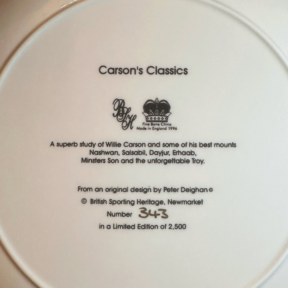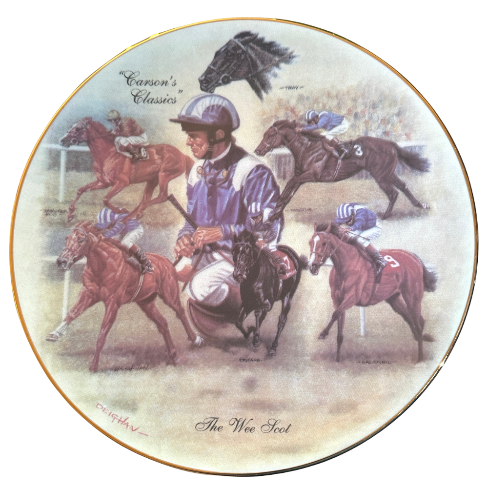 Commissioned by Sporting Heritage and painted by Peter Deighan. Featuring Willie Carson’s greatest mounts including Derby winners, Nashwan and Erhaab, Leger winner Minster Son, Salsabil, the Oaks and Irish Derby winner and, the fastest horse Willie ever sat on and always included in Willie’s very own list of his best horses, the brilliant Dayjur. Of course, no record of ‘Carson’s Classics’ would be complete without the unforgettable Troy, a brilliant winner of the 1979 Bi-Centennial Derby by no less than seven lengths showing an electrifying burst of speed. A wonderful Limited Edition Collector’s plate in fine bone china, measures 9″ in diameter and is hand numbered and edged in 22 carat gold.