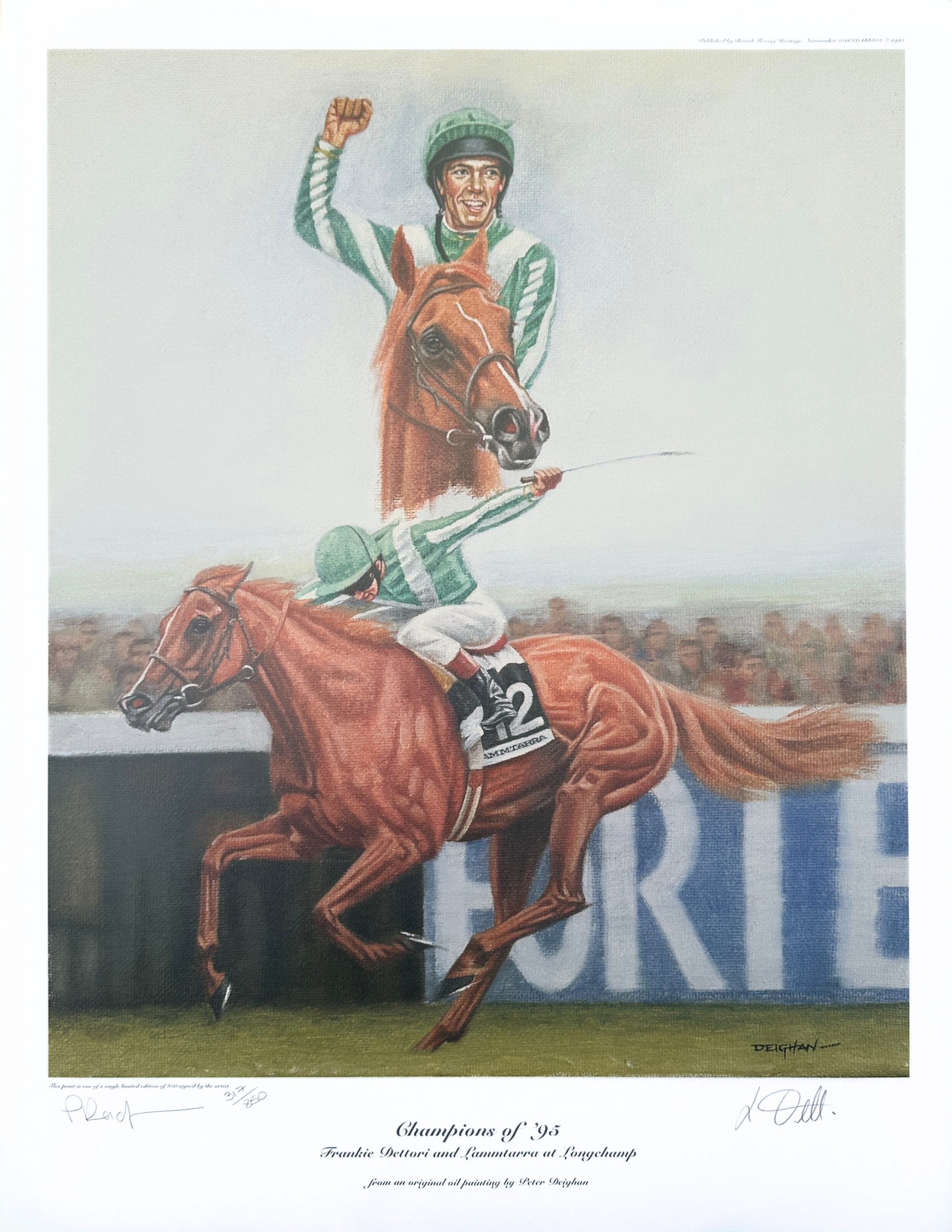 Limited Edition print, by Peter Deighan. Frankie Dettori and Lammtarra at Longchamp. Signed by the Artist and Frankie Dettori. Approximate print size 46 x 59cm.