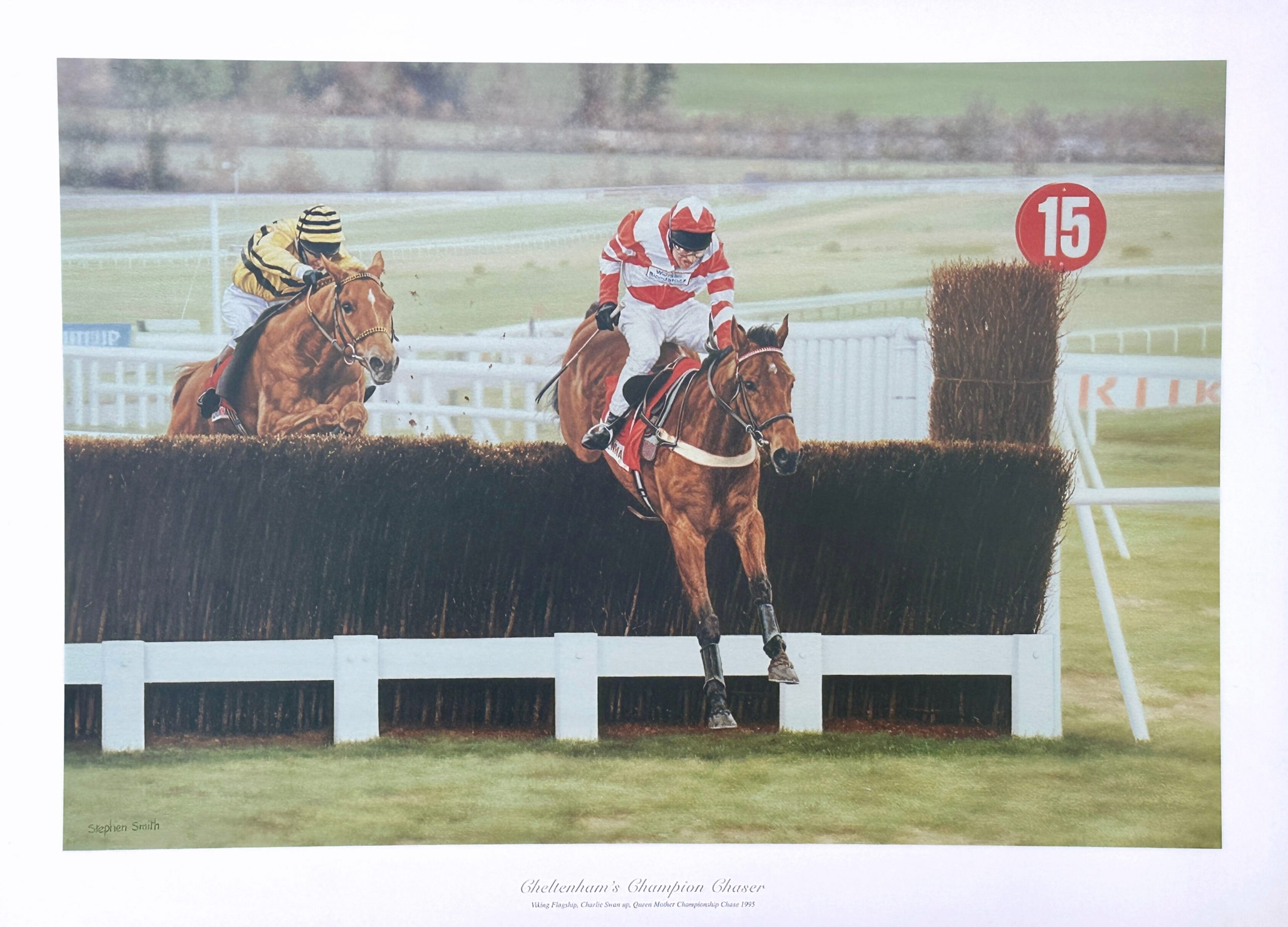 Limited Edition Print depicting Viking Flagship a gutsy winner of the two mile, Queen Mother Champion Chase at Cheltenham by Stephen Smith. Appoximate print size 57 x 42cm.