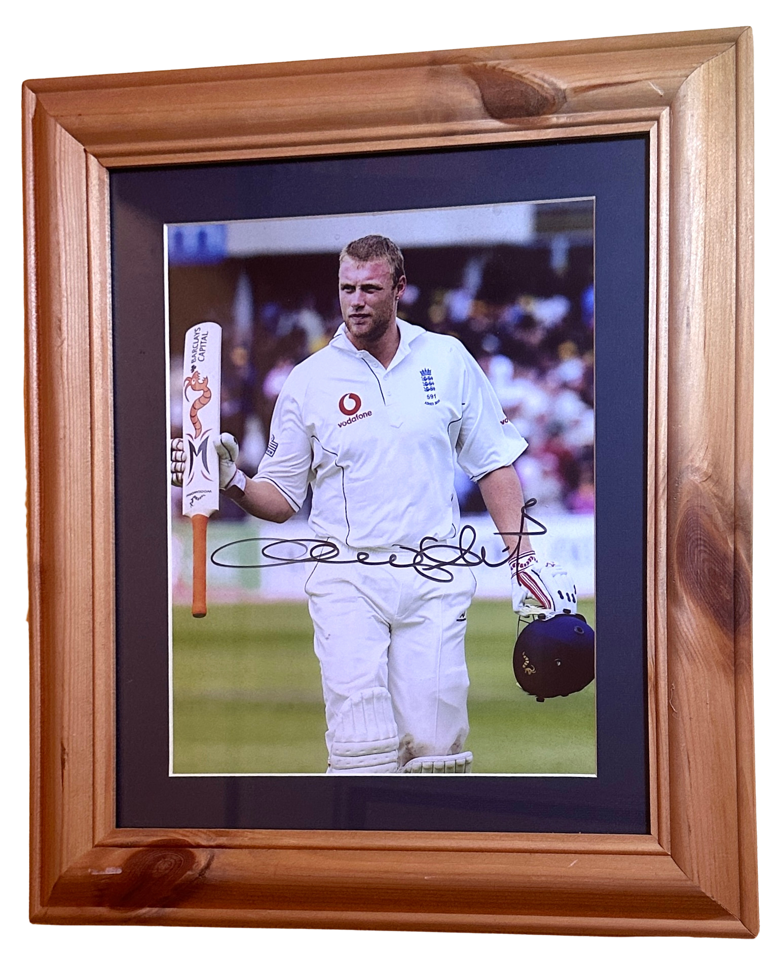 Signed and framed photo of Freddie Flintoff, ready to display. Frame measures approximately 38 x 31cm.