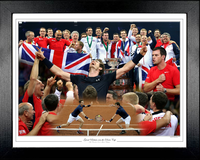 A Superb and unique montage featuring the brilliant moment, in November 2015, when the Andy Murray inspired Great Britain team won the Davis Cup in Belgium. This brilliant colour print measuring 16” x 12” with printed border and framed beautifully features the whole of the team and that ecstatic moment when Andy Murray was chaired by the team following his brilliant singles win against David Goffin of Belgium. An excellent opportunity to own a piece of sporting history – A true collectors item!