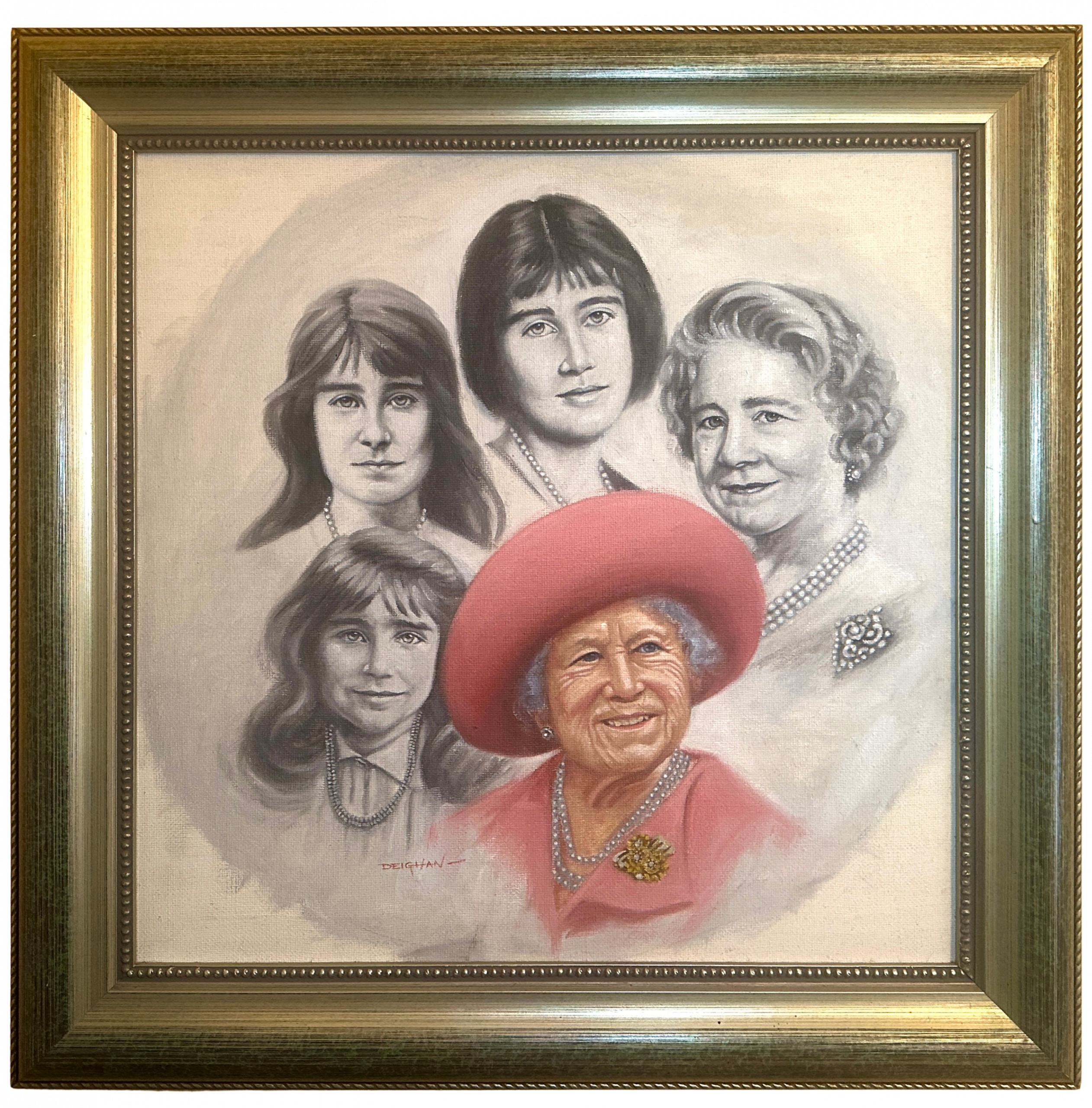 A very special work of art by the esteemed artist, Peter Deighan which captures the former patron to The Jockey Club, Her Majesty, Queen Elizabeth, the Queen Mother over the course of her lifetime’s involvement with the sport of horseracing. A prolific Owner, Her Majesty, unlike her daughter, Queen Elizabeth II who preferred flat racing, was a staunch supporter of the National Hunt variety, being Champion Owner in 1954 and 1957 though arguably her most famous horse was Devon Loch who famously stumbled agonisingly close to the finshing line, under Richard Pitman, when almost winning the 1956 Grand National. With over 400 winners in the National Hunt division, her other notable horses would have been Game Spirit and Special Cargo, both household names in NH circles. This exceptional work of art was commissioned prior to her sad death in 2002 but is an everlasting tribute to one of horseracing’s most ardent supporters. She will never be forgotten and this original work of art by the esteemed artist is an exceptional Collectors Item. Reluctantly offered for sale, it is in oil on canvas and is beautifully mounted and framed, measuring approximately 78 x 78cm.