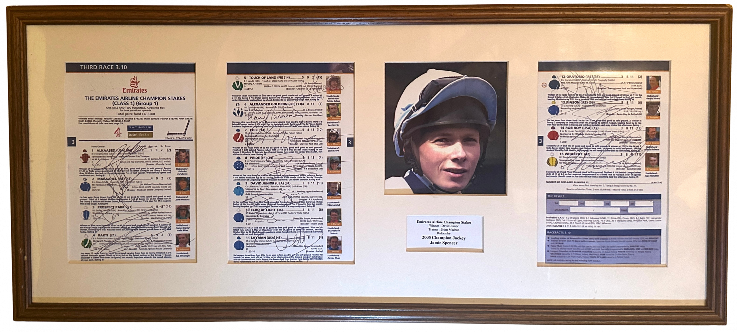 Montage depicting the Emirates Airline Champion Stakes. Won by David Junior, ridden by 2005 Champion Jockey, Jamie Spencer. Trained by Brian Meehan. Racecard signed by jockeys including Ryan Moore, Frankie Dettori and Kieran Fallon. Pre-owned. Please note there may be some minor scuffs to the frame due to age, which is reflected in the price. Frame measures approximately 69 x 31cm.
