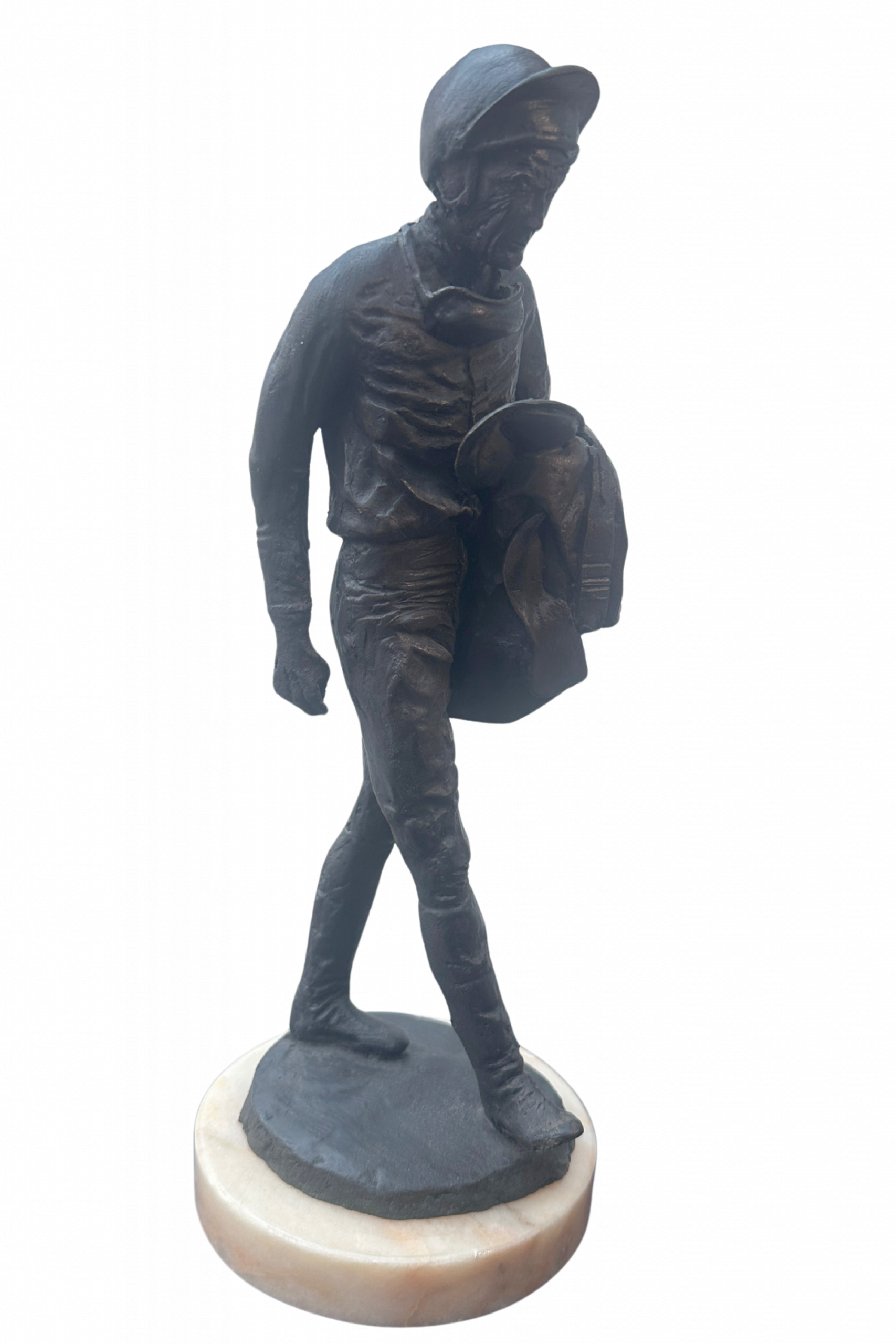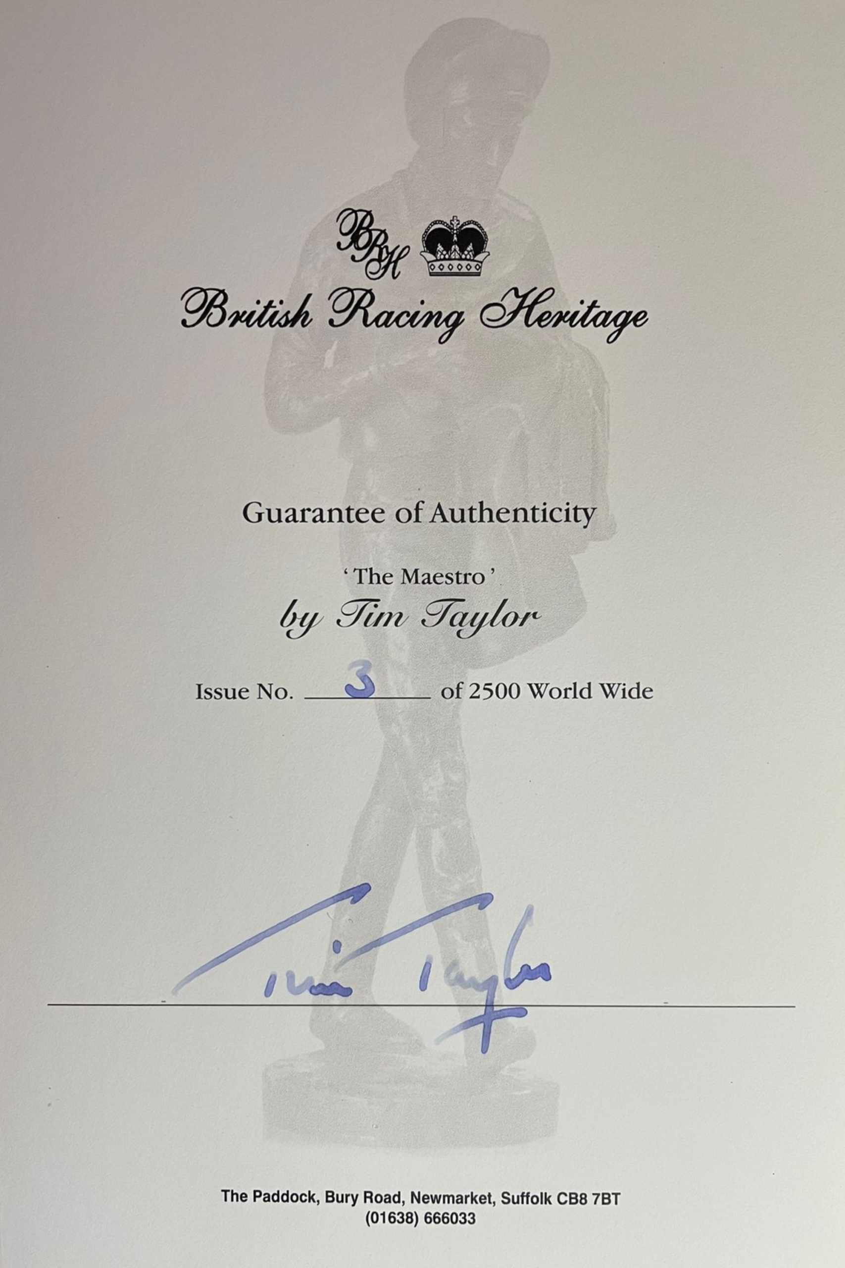 This superb study of ‘The Mestro’ by sculptor Tim Taylor beautifully captures the legend that was Lester Piggot, one of the greatest of all jockeys ever to have graced the ‘sport of kings’. The product of many months of painstaking work, Tim captures lester on his way back to the weighing room after another scinitllating success. Individually cast in bronzed resin before being hand-polished to bring out the beauty of a deep bronze patina. Mounted on a beautifully polished marble base and standing 10″ tall, ‘The Maestro’ is a real collectors item. Numbers 2 and 3 only available of a limited edition of only 2500 world-wide.