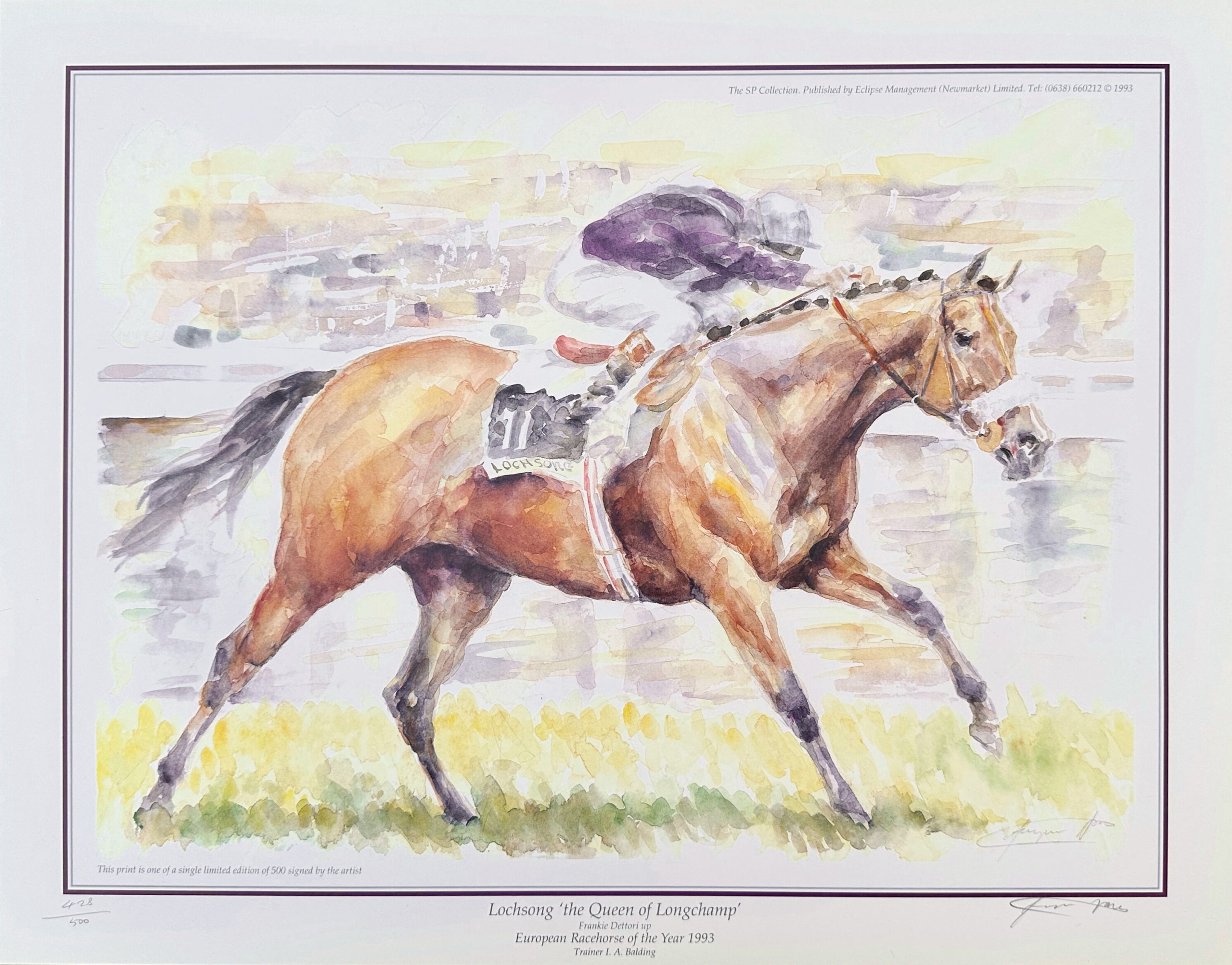 Limited Edition Print from a watercolour by Jacqui Jones featuring Lochsong, European Racehorse of the Year 1993, with Frankie Dettori aboard, trained by Ian Balding. Signed by the artist, and measures approximately 46 x 35.5cm.