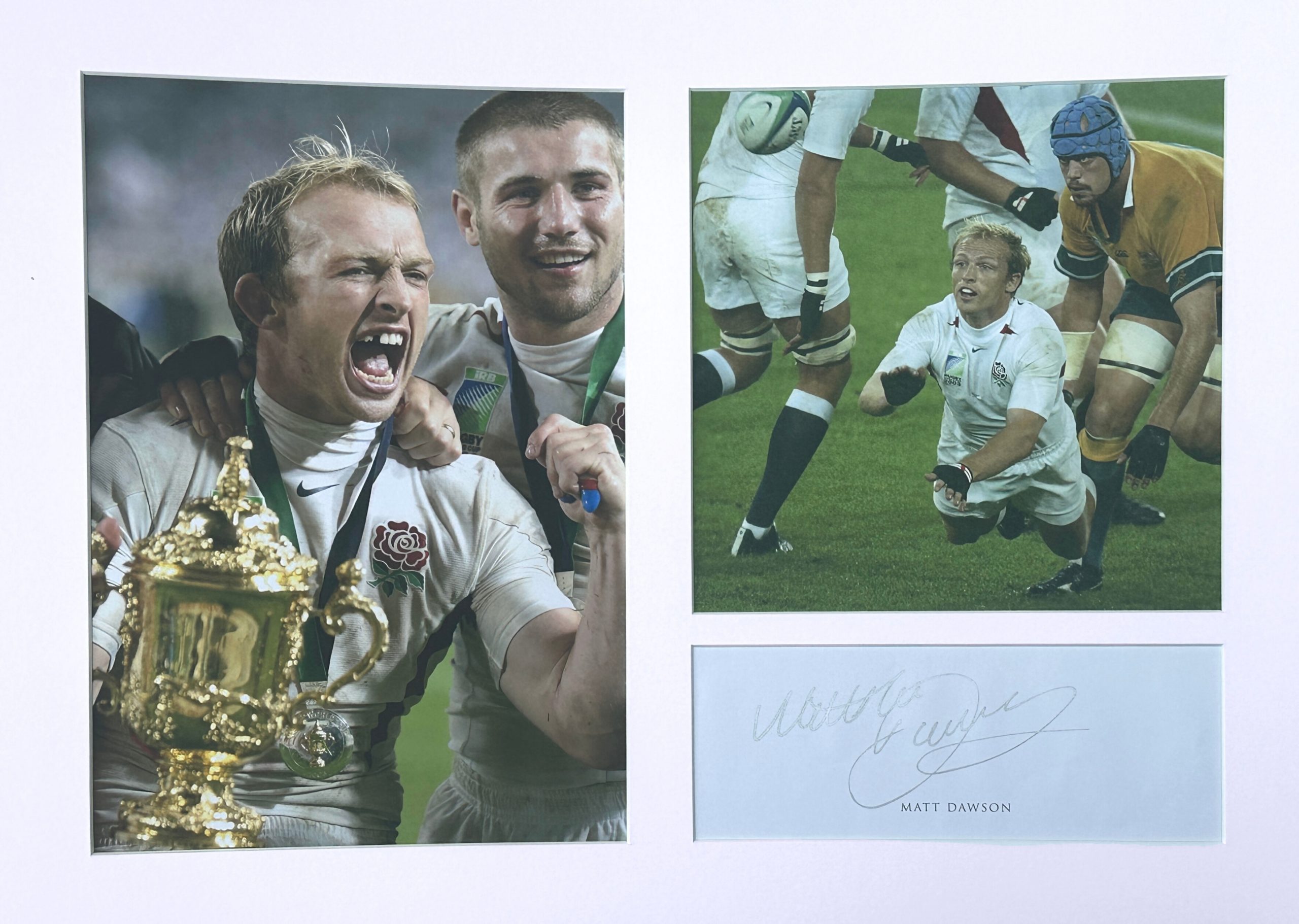 England’s most capped Scrum Half, a World Cup winner and Six Nations winning captain this montage features action images of Matt Dawson from the 2003 World Cup alongside his signature. Approximate size 50.5 x 37cm, ready for framing.