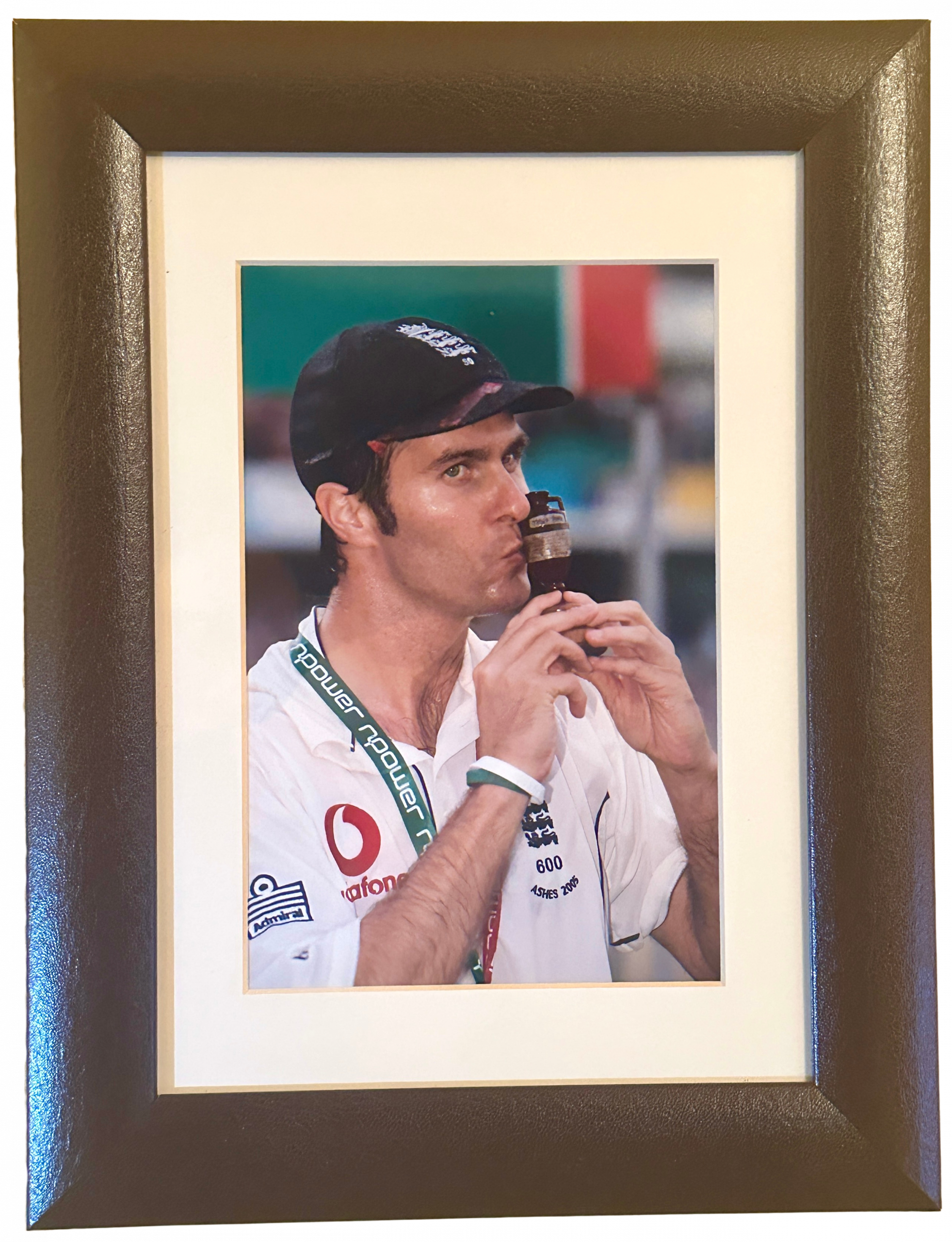 Michael Vaughan kisses the Ashes Urn. The Ashes 2005. Frame measures approximately 36 x 28cm.
