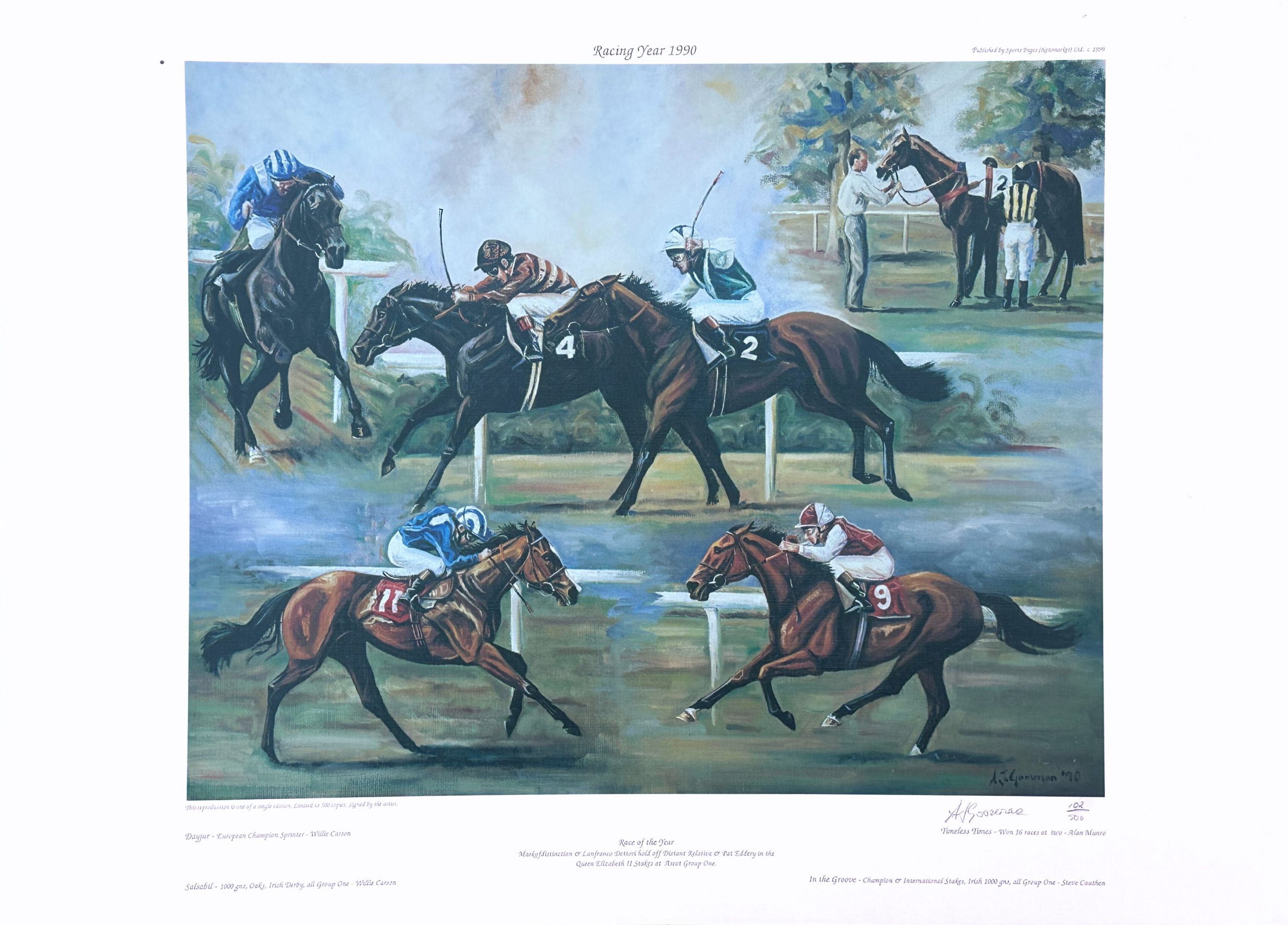 Limited Edition Print. Signed by the Artist, Amanda Gooseman. The Racing Year, 1990, depicting all the very best horses of the year. Horses featured, from top left, Champion Sprinter, Dayjur with Willie Carson aboard, Champion 2yo, Timeless Times, the winner of a record SIXTEEN races as a 2yo, a record likely to remain unbeaten for many, many years to come. Ridden for fifteen of those races by Alan Munro. In the Groove, a magnificent filly, the winner of the Juddmonte International and Champion Stakes, Steve Cauthen up and Salsabil, the winner of the 1000 Guineas, Epsom Oaks and Irish Derby, a remarkable filly also ridden by Willie Carson. The centrepiece is the finish of the QEII at Ascot when Markofdistinction with Frankie Dettori up, became Champion Miler when beating off, Sussex Stakes winner, Distant Relative and Pat Eddery. Approximate print size 65 x 47cm.