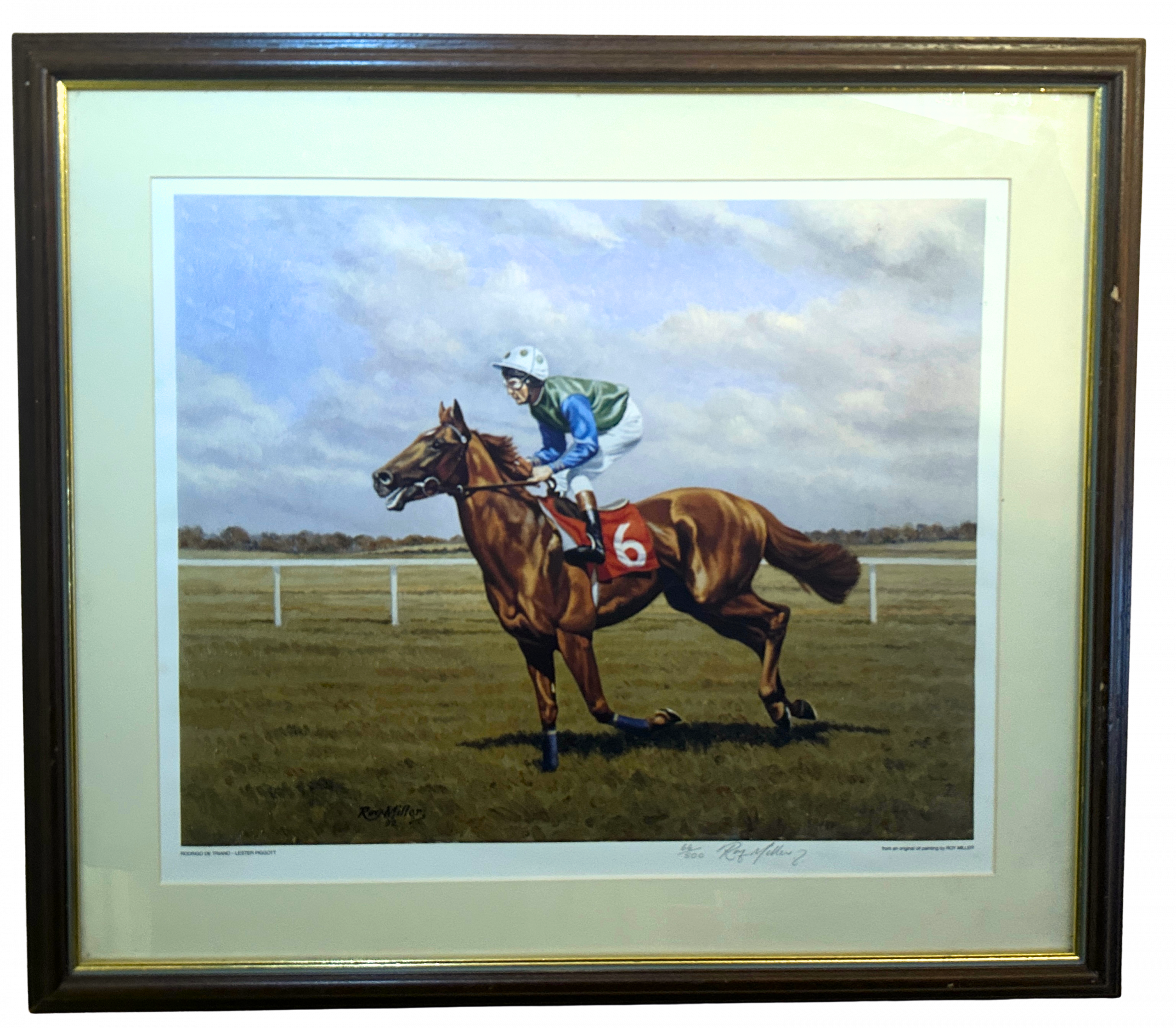 A superb, mounted and framed, limited edition print by Roy Miller featuring the superb Classic winner, Rodrigo de Triano and Lester Piggot who teamed up to win the 1992, Two Thousand guineas at Newmarket providing the jockey with his 30th Classic success. It was the beginning of a most fruitful partnership, pairing the maestro’s craft, guile and horsemanship with a horse whose willingness, courage and exhilarating turn of foot executed perfectly his connections astute plans. Winner of Four Group one races in 1992, the parnership concluded with a thrilling win in the Champion Stakes st HQ and Roy’s superb study of the pair captures the ‘Classic Combination’ at HQ where the colt was trained, brilliantly by Peter Chapple-Hyam. Mounted and framed, measuring approximately 62 x 56cm. Please note, this item is pre-owned, there are some scuffs to the frame due to age, refelected in our price.