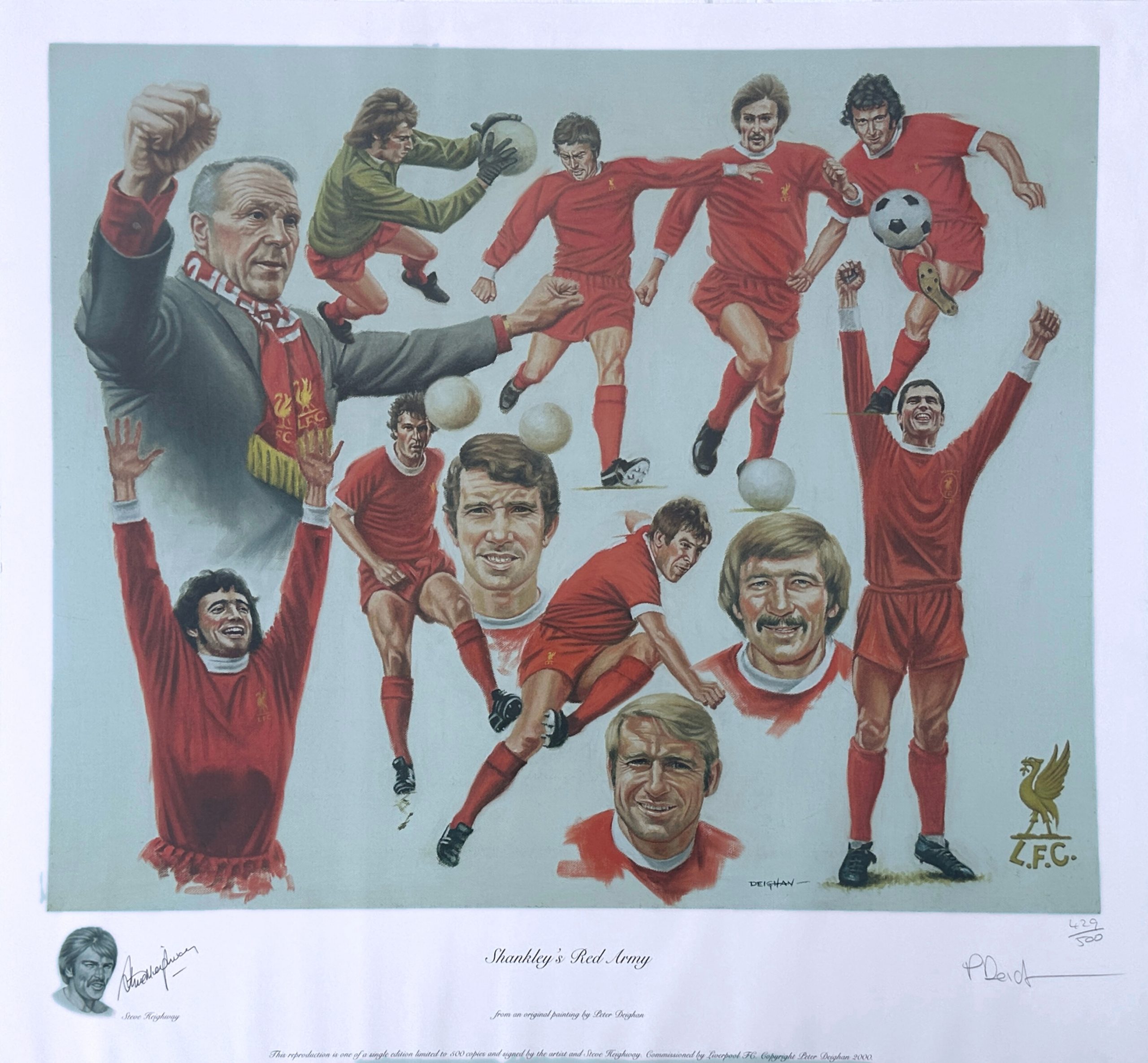 A Limited Edition fine art print by Peter Deighan. From the early seventies right through to the eighties British, indeed, European football was, arguably, dominated by Liverpool Football Club. In these superb works of art, in conjunction with the Club, supreme portrait artist, Peter Deighan has captured the stars and their managers that helped keep the Club at the forefront of the game. In the first, ‘Shanks’ is accompanied by the starts of the sixties and seventies, Yeats, St John, Hunt, Smith, Heighway, Keegan, Hughes etc. etc. Published in a limited edition of 500, each print has been personally signed and numbered by the Artist and Steve Heighway. Approximate print size 53.5 x 50cm. Please note, our price is for the unframed, limited edition print.