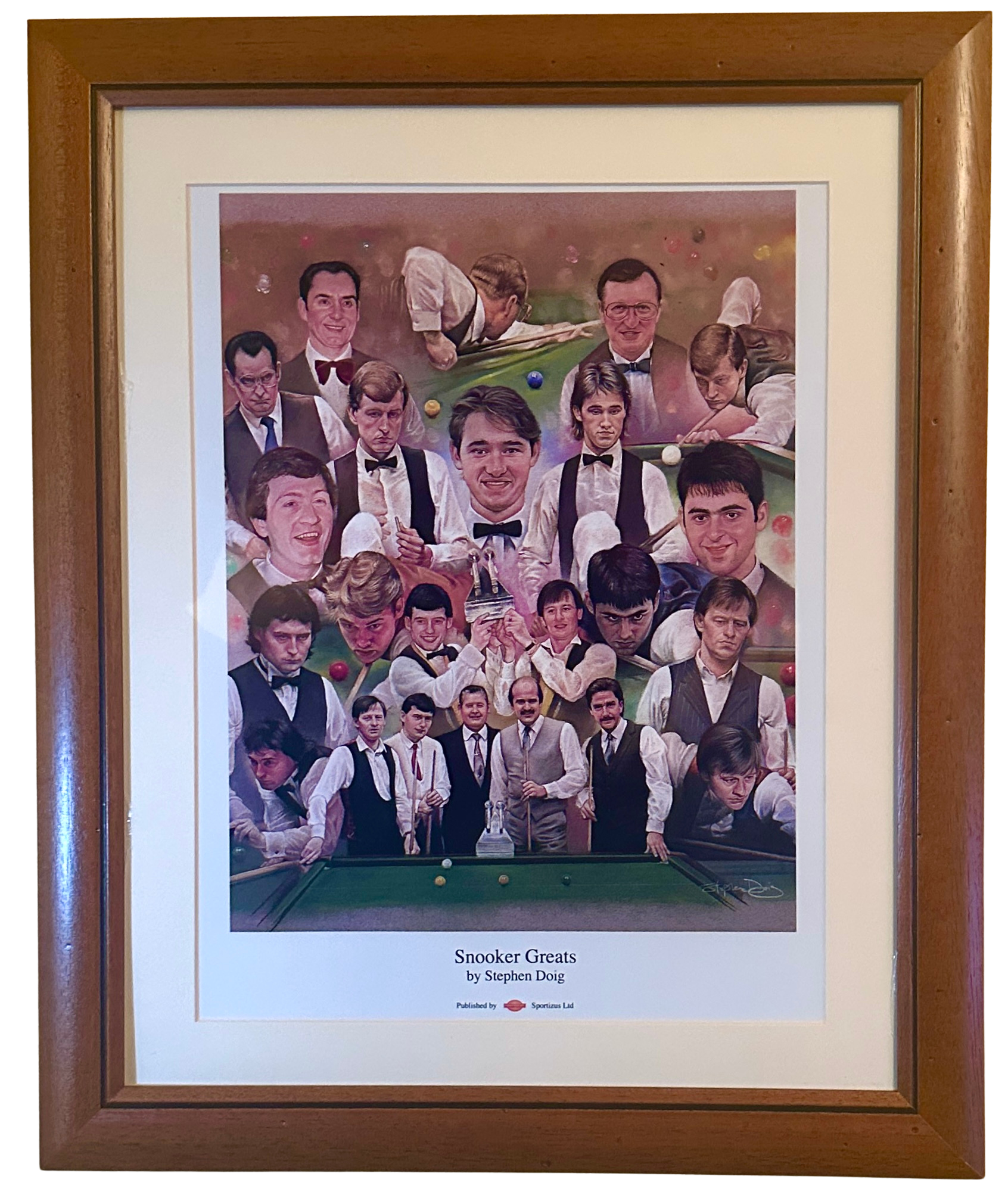 Framed Print by Stephen Doig. Twenty of the world’s top snooker players featuring Jimmy White, Alex Higgins, Stephen Hendry, Ronnie O’Sullevan and many more. Frame measures approximately 42 x 51cm.