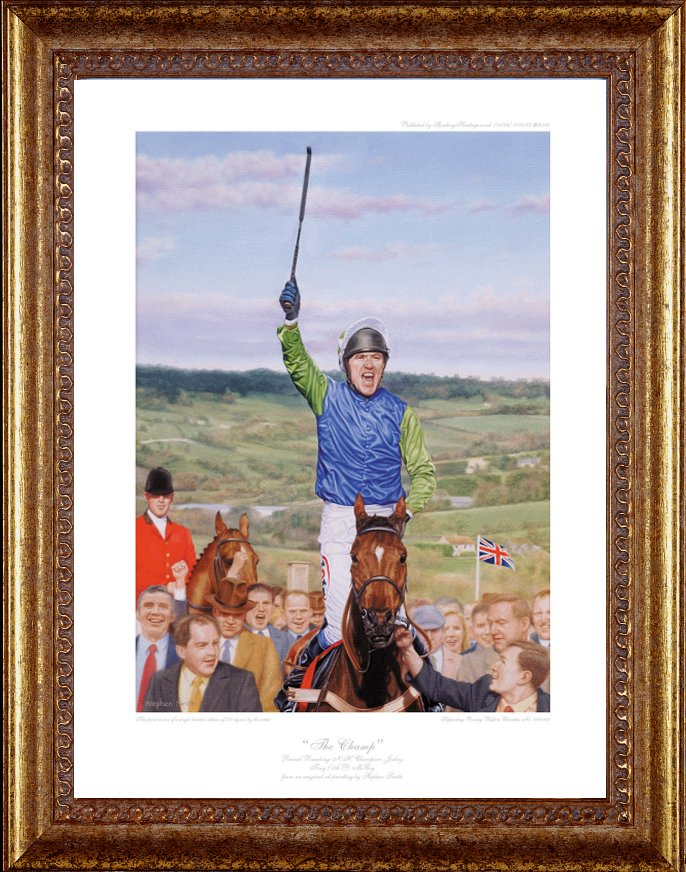 A Limited Edition fine art print by Stephen Smith.. The undisputed Champion National Hunt Jockey, Tony (AP) McCoy broke almost every record in the book in his illustrious career and there could scarcely ever have been a sport that has been so dominated by any one man as was the National Hunt scene during his career. Continuously pushing himself to the absolute limit of human endurance whilst constantly battling with the scales, he set standards that will almost certainly never be beaten. In this superb composition and most poignant work of art, Stephen Smith has captured McCoy joyously returning, once again, to a tumultuous reception in the winners enclosure at Prestbury Park, Cheltenham. To celebrate McCoy’s remarkable achievements, this work of art was commissioned and this print was published in a single limited edition of only 950 world-wide. Each print has been scrutinised and personally numbered and signed by the artist. A terrific opportunity to purchase not only a superb work of art but also a piece of British Sporting History. To celebrate McCoy’s remarkable achievements, this work of art was commissioned and the print, published in a single limited edition of only 950 world-wide, measures 375mm x 505mm, each print has been scrutinised and personally numbered and signed by the artist. A terrific opportunity to purchase not only a superb work of art but also a piece of British Sporting History. Beautifully framed and ready to display.