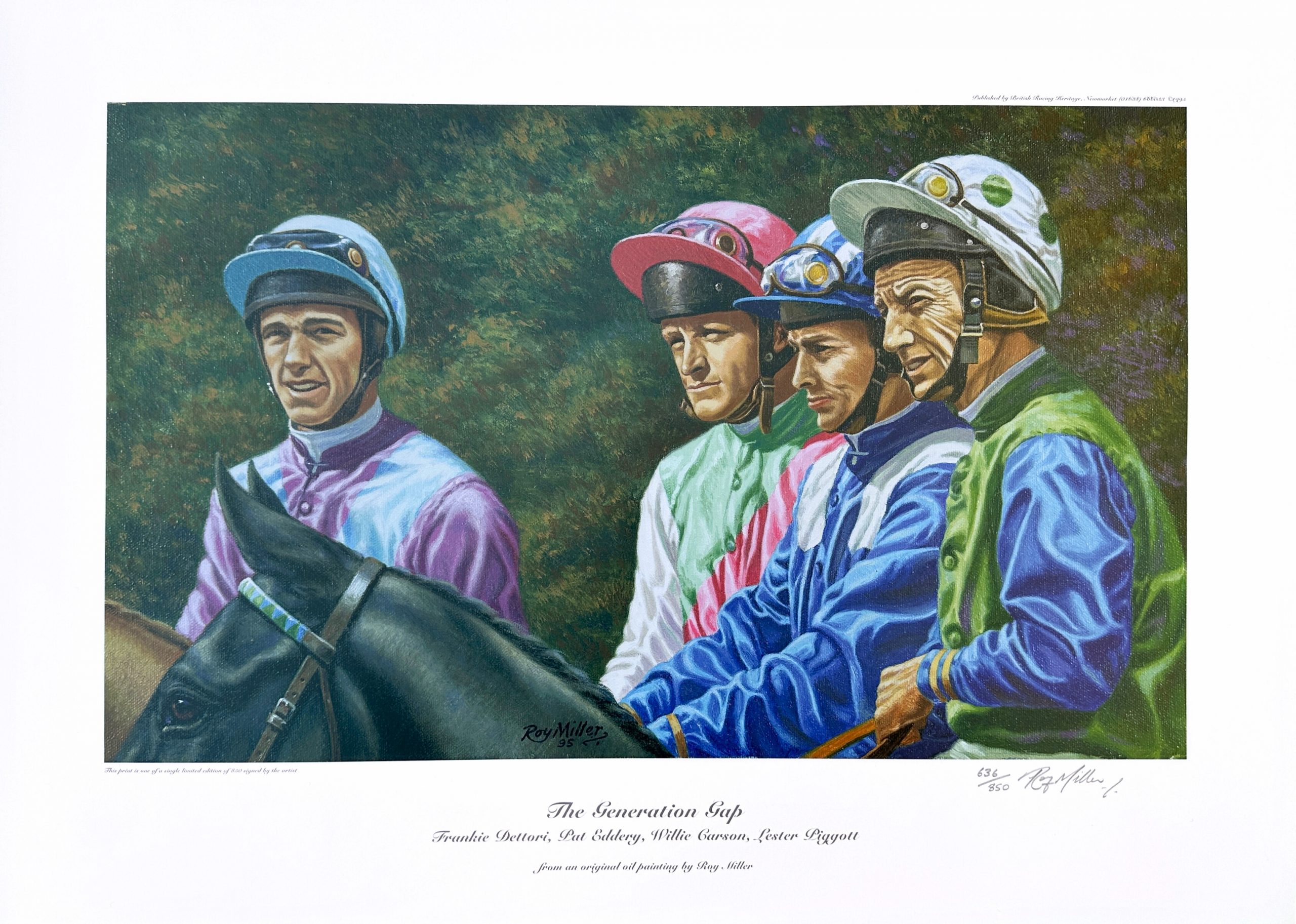 Limited Edition Print by Roy Miller, signed by the Artist and, in a scene from the late eighties, features a young Frankie Dettori upsides the well established and hugely experienced trio of Pat Eddery, Willie Carson and Lester Piggott. Each print numbered and signed by the artist and measures approximately 58 x 41cm.
