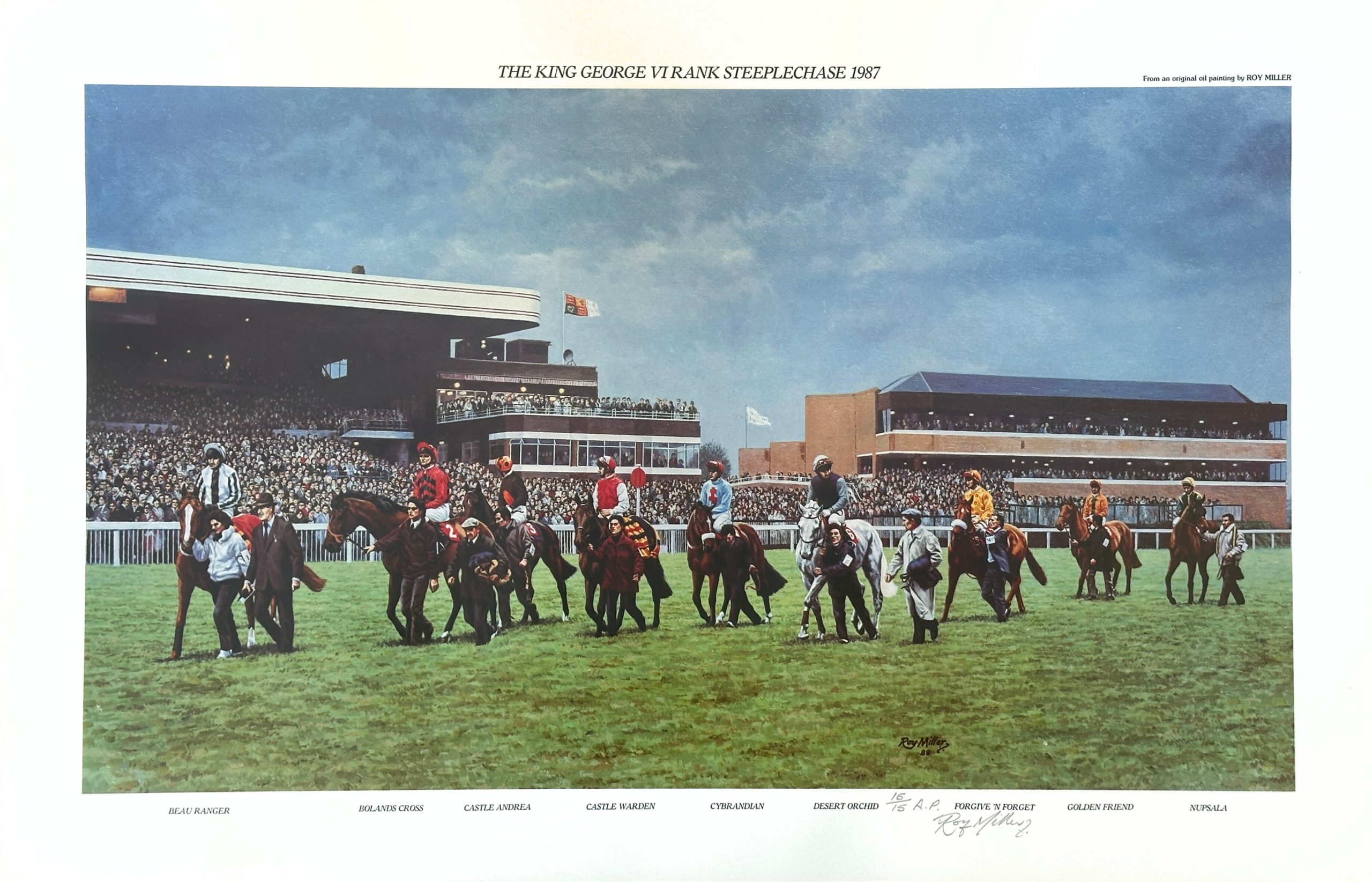 Limited Edition Print by Roy Miller features the line up for the 1987 King George on Boxing day at Kempton Signed by the Artist. Features old favourites, Desert Orchid, Forgive ‘n Forget and Cybrandian. Approximate print size 67 x 44cm. *Please Note, this print has some slight colour imperfections to the white border but will frame well.