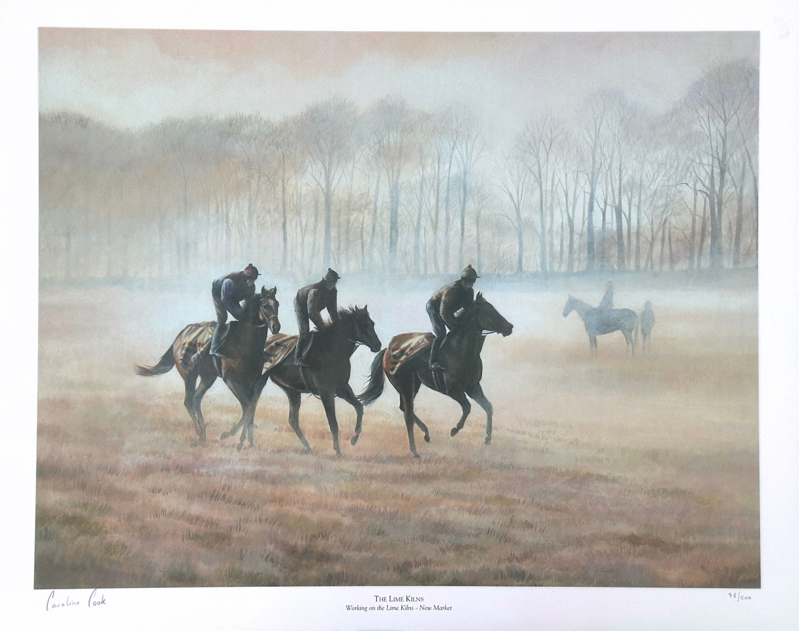 Limited Edition Print by Caroline Cook, depicting the world famous Limekilns gallops in Newmarket. Signed by the Artist. Approximate print size 51 x 41cm.