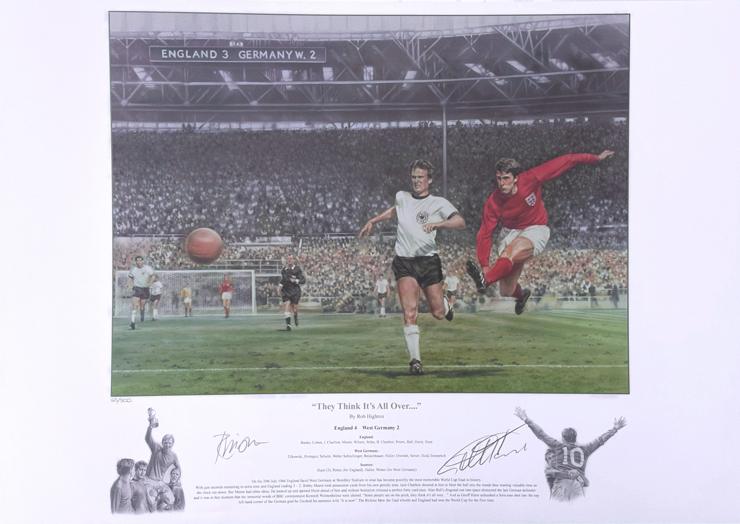 Limited Edition print by Robert Highton. A superb limited print from an original work of art commemorating the moment Kenneth Wolstenholme so aptly described “…it is now!”. Holding legendary status this goal sealed England’s only ever win in the premier international competition, the World Cup the edition of 300 was sold out but we retained one, signed by hat-trick hero, Sir Geoff Hurst, the only surviving member of that great team and now available to you. Approximate print size 70 x 49cm and ready to be framed..