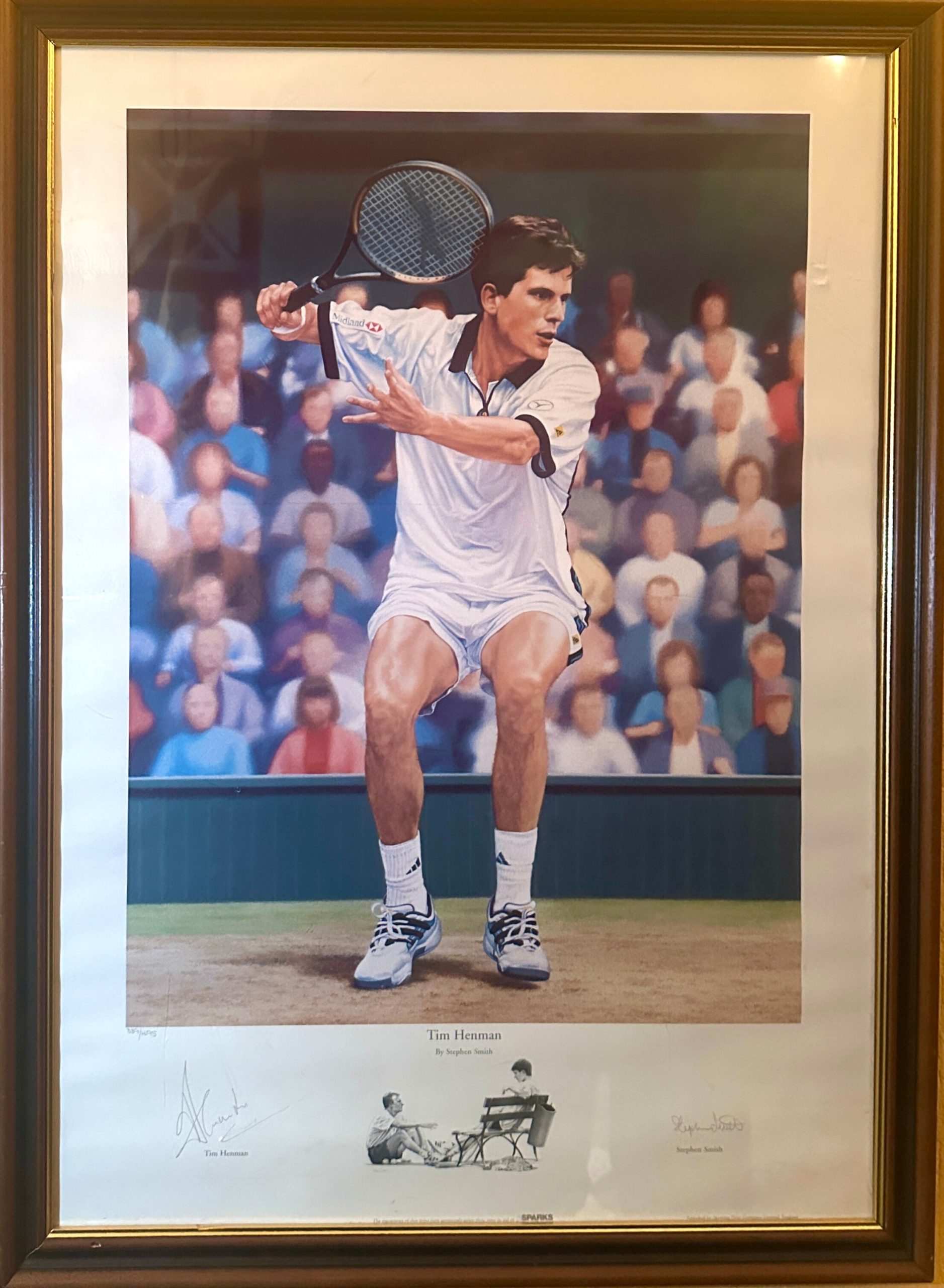 Pre-owned and part of a personal collection, this framed, Limited edition print of 495, by Stephen Smithis an excellent portait of Britain’s former No 1. The Great British public will always love Tim Henman because of his heroic performances at Wimbledon and in the Davis Cup. Signed by Tim Henman and the Artist. Please note, this item is pre-owned, there are minor scuffs to the frame due to age, refelected in our price. “Come on Tim!” Frame Measures approximately 75 x 55cm.