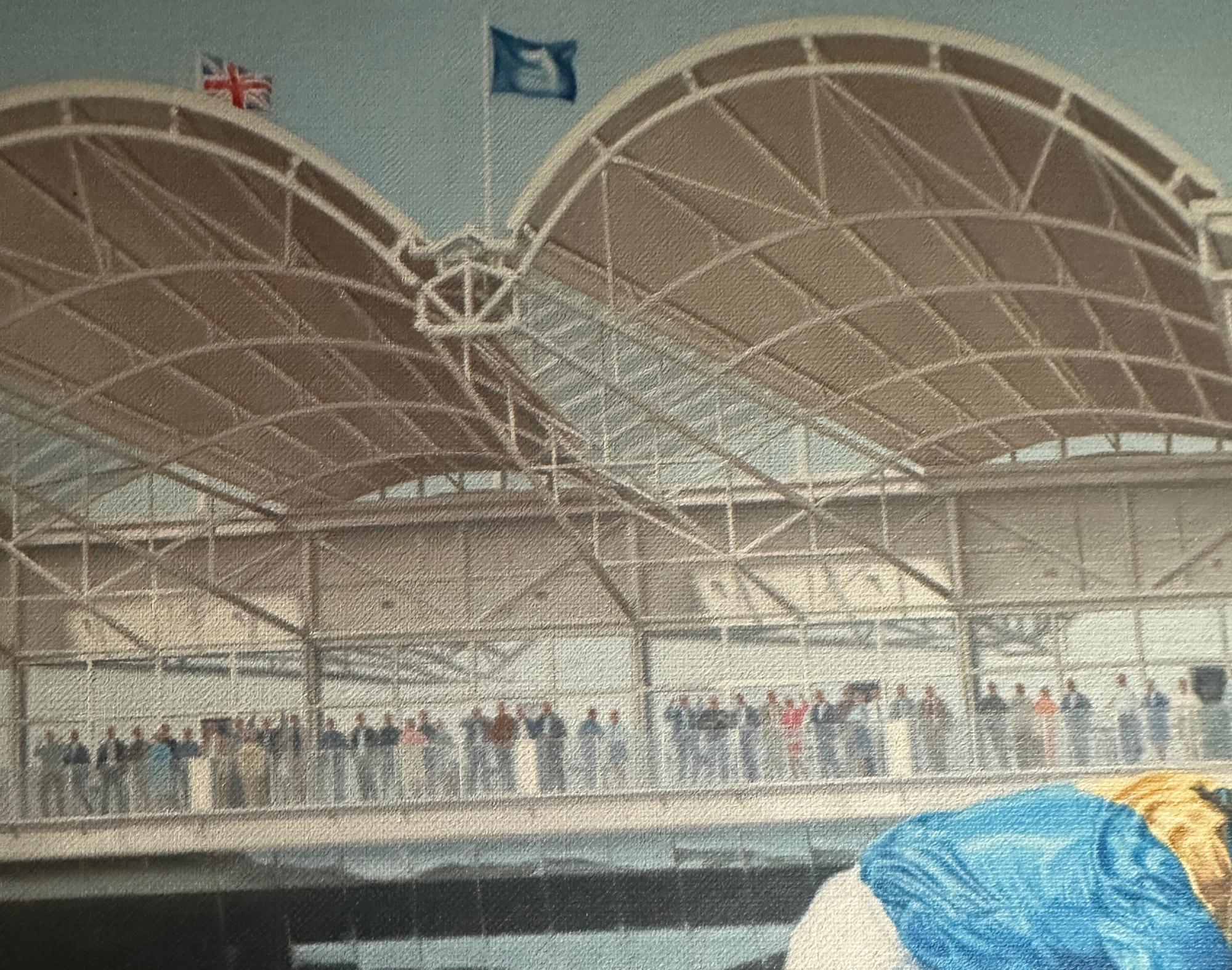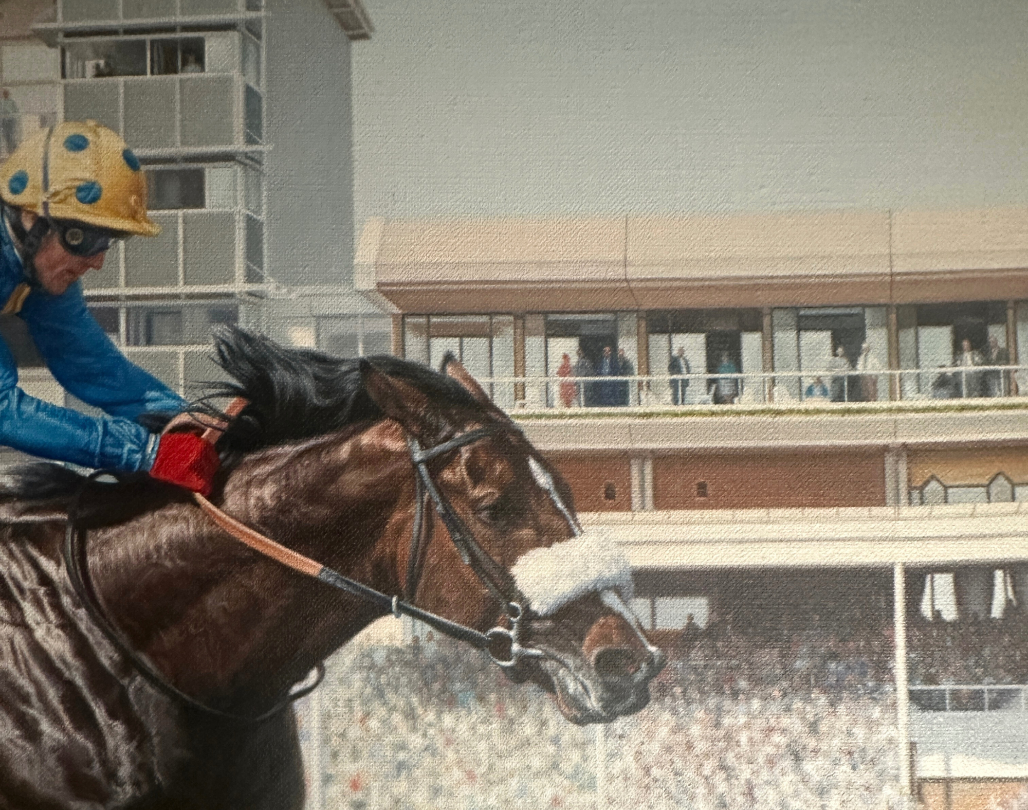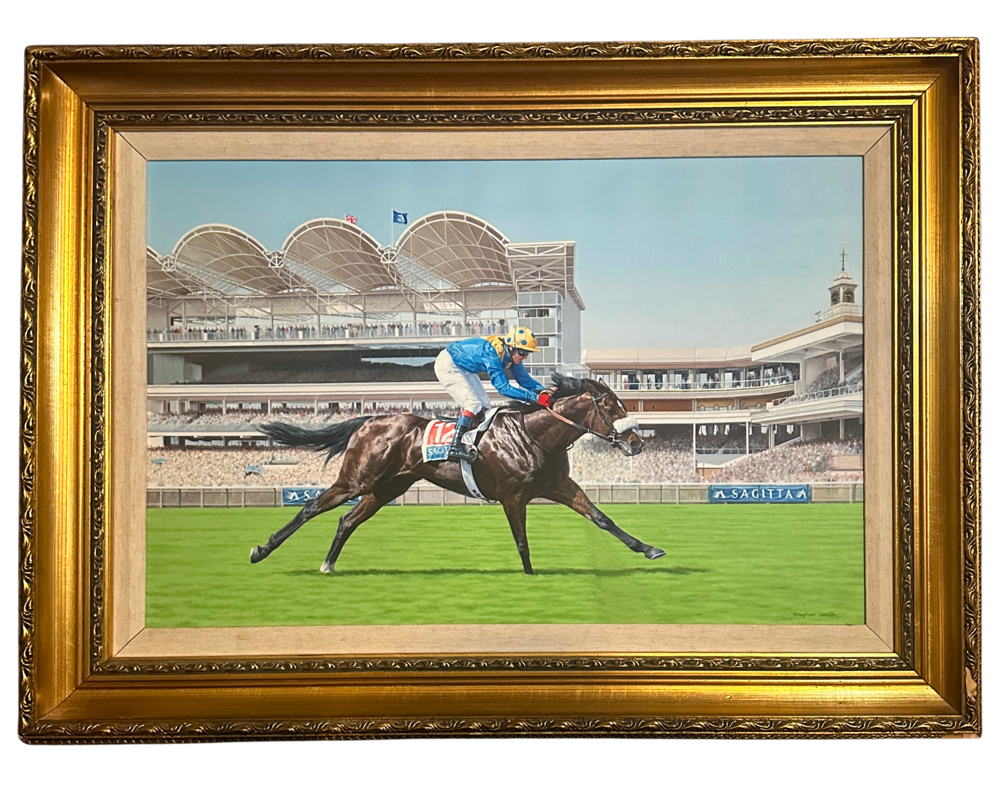 Commissioned by our MD to celebrate the first running of the first Classic of the season in front of the new Millennium Grandstand at Newmarket. This Original acrylic painting by Stephen Smith celebrates the most emphatic British Classic victory for many, many years and the artist has captured both the power and elegance of Kings Best as he winged his way to success in the first Classic of the new Millennium, the Two Thousand Guineas, under Kieran Fallon. Trained by the mercurial Sir Michael Stoute, we saw far too little of the brilliant colt but this magnificent work of art captures forever his unique place in the Classic hall of fame! “Two Thousand” is a true work of art and a magnificent collectors item. Both beautifully and elegantly framed, it measures approximately 80 x 58cm.