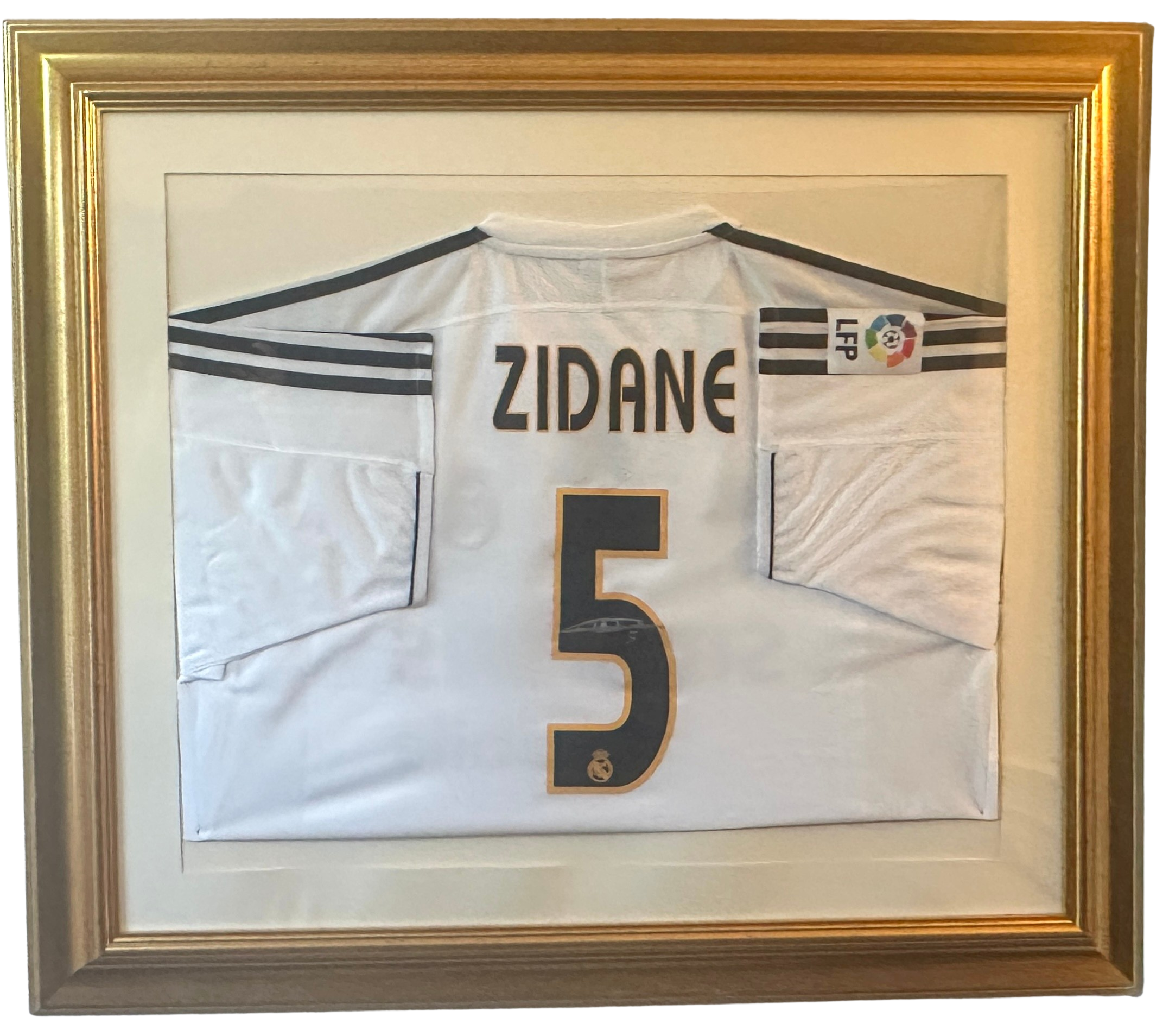 During the Real Madrid ‘Galacticos’ period there was never ever any more visible galactico than Zinedine Zidane or Zizu, as he was known. He shone like a beacon, not only in their midfield but, of course, also for France whom he led to World Cup glory. His familiar No 5 shirt present in most of their best performances and this shirt found its way to us via former jockey, Graham Bradley who was, of course, bloodstock agent to Robbie Fowler and, of course, Steve Macmanaman, himself one of their famed galacticos. Superbly mounted and framed this genuine Real Madrid shirt is signed by ‘Zizu’, Zinedine Zidane himself and is ready to display. Frame measures approximately 73 x 83cm. A must for any self respecting collector of genuine signed shirts.